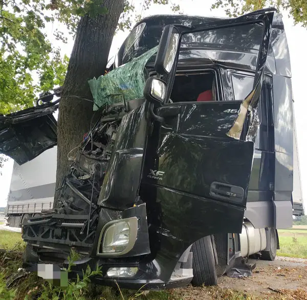 Kierujący ciężarówką chcąc uniknąć zderzenia zjechał na prawe pobocze i wtedy uderzył w przydrożne drzewo.