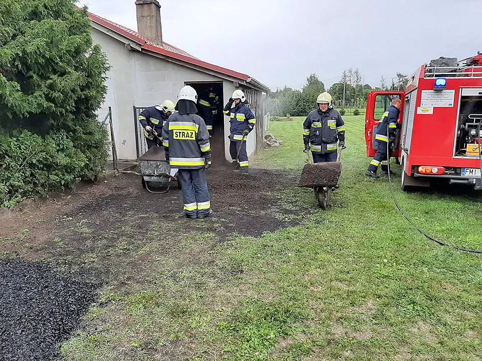 Strażacy OSP Skwierzyna walczą z nietypowym pożarem. Zapalił się węgiel w składzie w Murzynowie. Teraz strażacy muszą ręcznie usunąć aż 15 ton węgla.