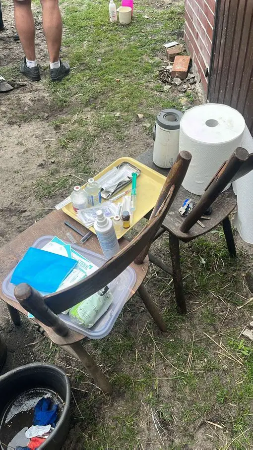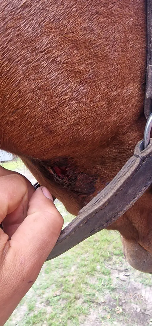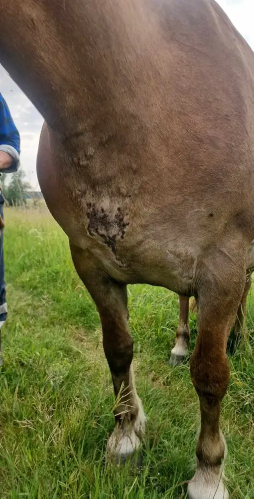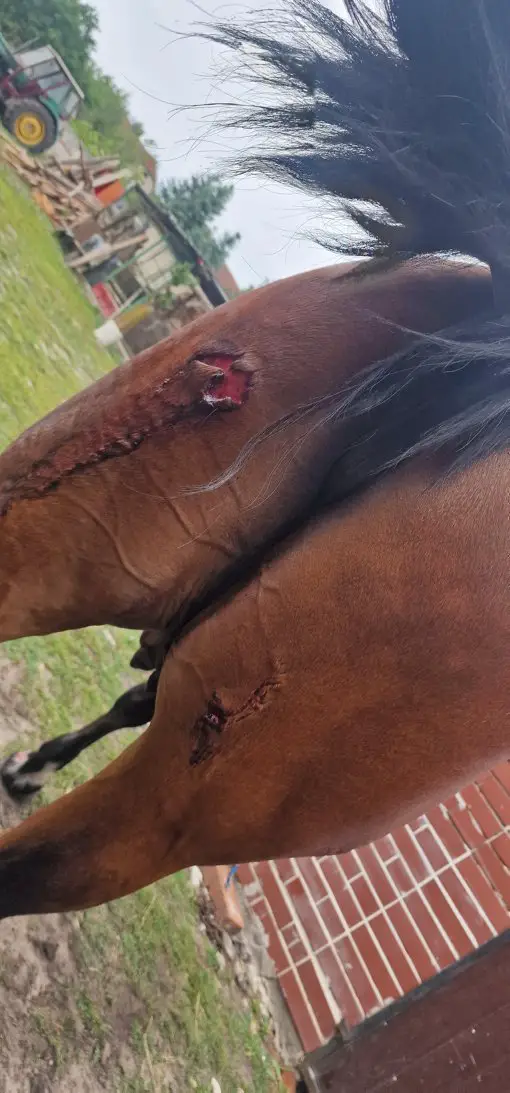 Czas na oględziny koni. Koszmar. Pogryzione nogi, chrapy, żuchwa, wymiona, piersi i zady. W efekcie, siedem ran szarpanych, liczne zadrapania. Szybki telefon do weterynarza, w słuchawce „będę za godzinę”. Tamuje krwawienia, czekam. W międzyczasie Darek przywozi opatrunki. Po przyjeździe Pani doktor, czas na szycie. Poszło w miarę sprawnie. Po kilku godzinach dzwoni tata, prosi żeby ktoś przyjechał. Pojechała szwagierka. Efekt: Stłuczone biodro, zwichnięty obojczyk, skręcony nadgarstek i liczne stłuczenia na nogach i rękach. Na szczęście bez złamań.