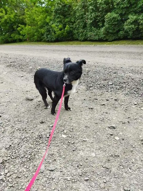 Nie wiadomo jak długo suczka była w lesie. Jest bardzo wystraszona, płochliwa oraz nieufna.