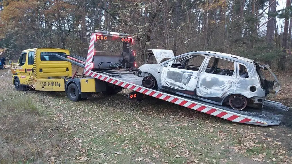Znalezione w spalonym aucie kości należą do człowieka. To między innymi żuchwa i oczodół. Na miejscu pracował wezwany biegły z dziedziny pożarnictwa. Tablice rejestracyjne spalonego samochodu zostały znalezione wyrzucone w lesie. Na polecenie policji spalony samochód zabezpieczyła pomoc drogowa Maxmar.