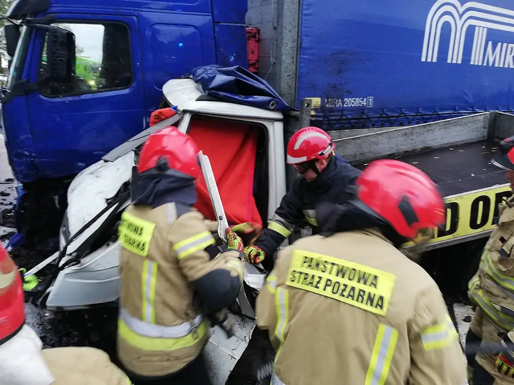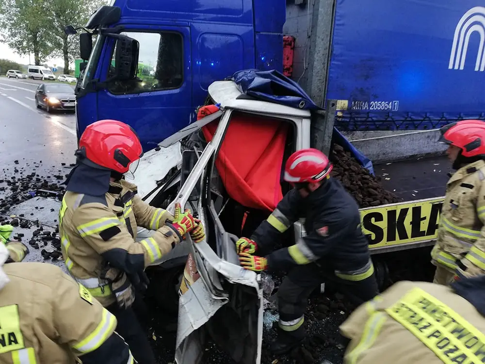 Świebodzińscy strażacy sprzętem hydraulicznym musieli wycinać zakleszczonego w samochodzie dostawczym kierowcę. W takich momentach liczy się nie tylko czas, ale również precyzja.