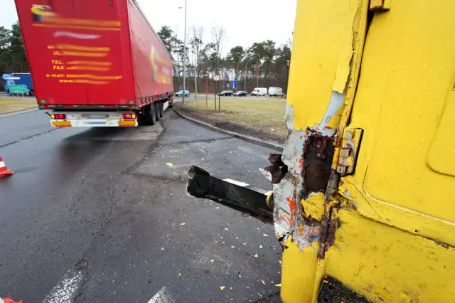 Do zdarzenia doszło we wtorek około godz. 14.40 na rondzie Rady Europy w Zielonej Górze. Tir zahaczył o ciężarówkę pracowników zajmujących się łataniem dziur w drogach.