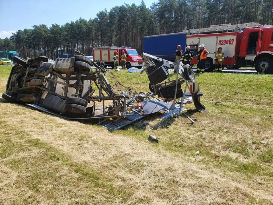 Samochód drogowców wypadł z drogi i rozpadł się na kawałki. Na miejsce dojechały wozy strażaków z Międzyrzecza oraz OSP Dąbrówka Wielkopolska. Dojechała również międzyrzecka policja.