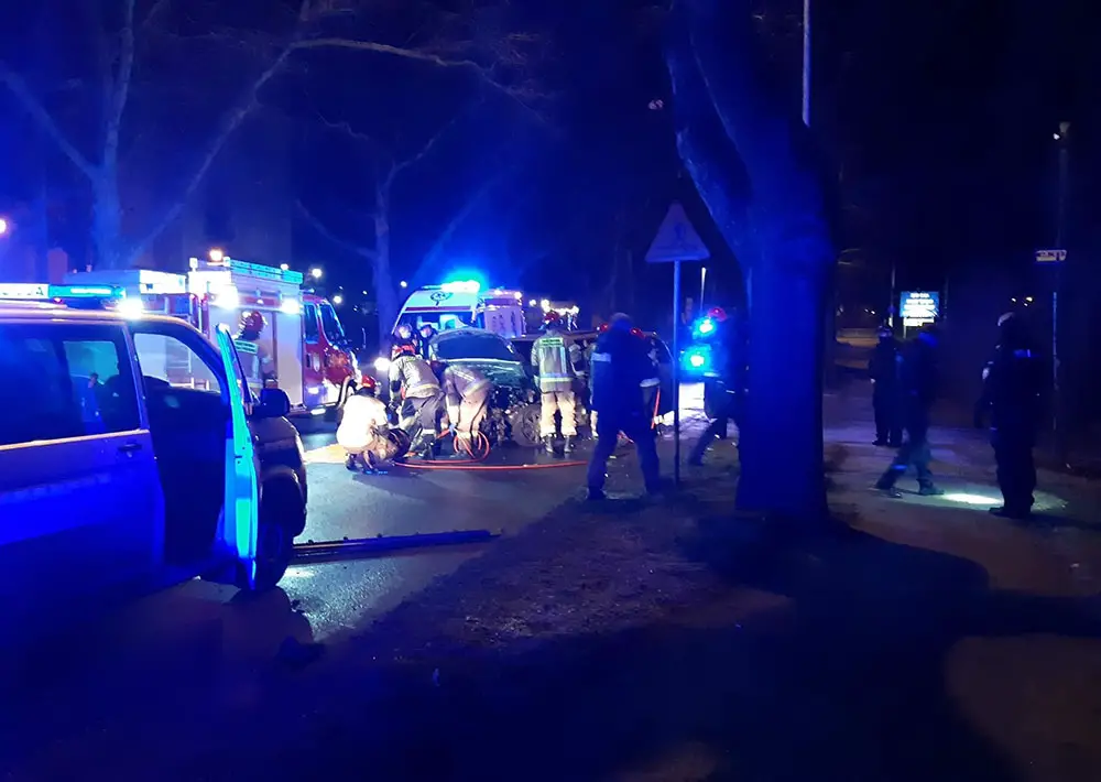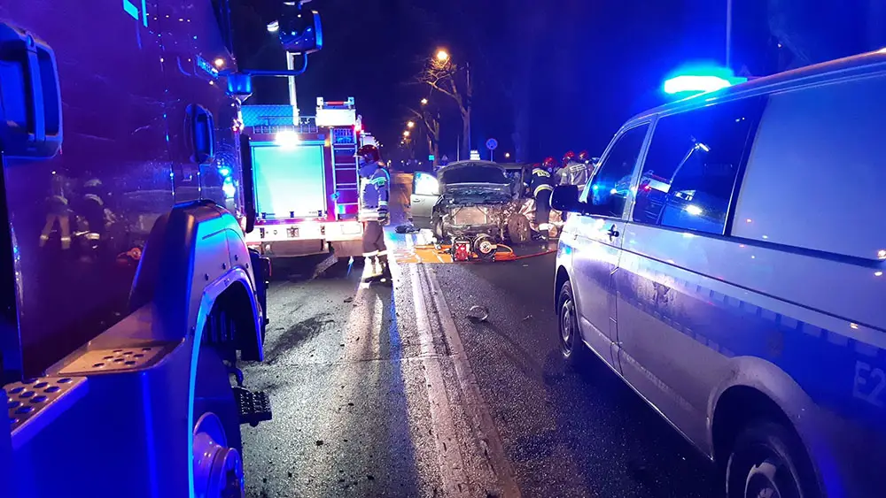 Na prostym odcinku ul. Wojska Polskiego chrysler roztrzaskał się o drzewo. Kierujący został zakleszczony w aucie. Uwalniali go strażacy.
