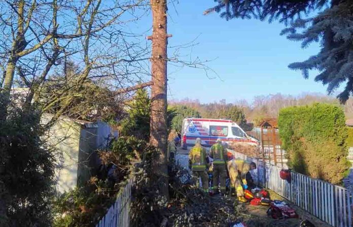 Wszystko wydarzyło się, w czwartek 21 stycznia, około godz. 9:59. Straż pożarna w Obornikach dostała zgłoszenie o mężczyźnie, który spadł z drzewa na Rodzinnych Ogródkach Działkowych ul. Czarnkowska w Obornikach. Po dojeździe strażaków na miejsce zdarzenia kierujący działaniem zastał na miejscu mężczyznę leżącego na ziemi. Spadł z drzewa z wysokości około ośmiu metrów. Świadkowie zdarzenia poinformowali, że mężczyzna nie daje oznak życia i jest prowadzony zewnętrzny masaż serca – podała mł. asp. Agata Kamińska, z obornickiej straży pożarnej.
