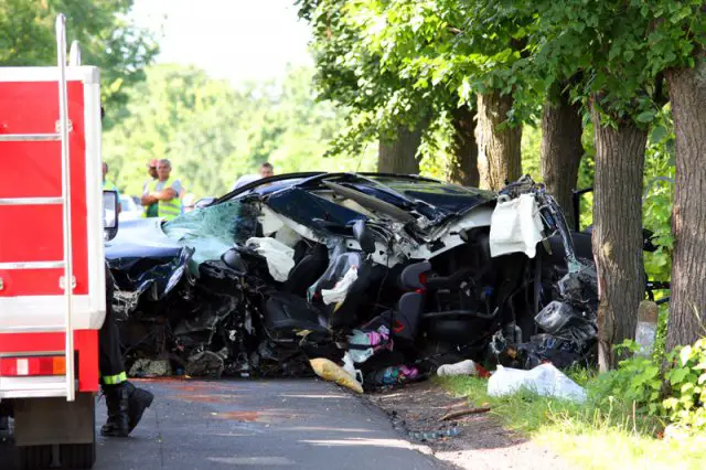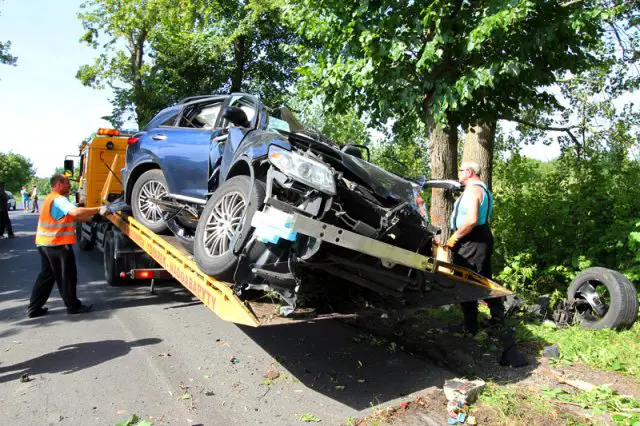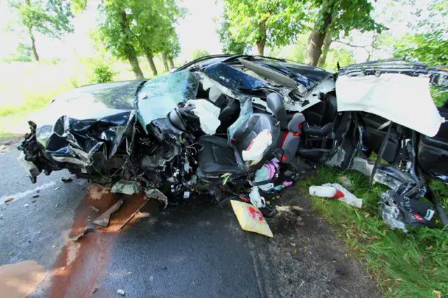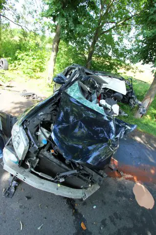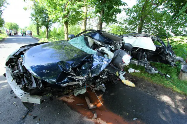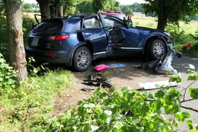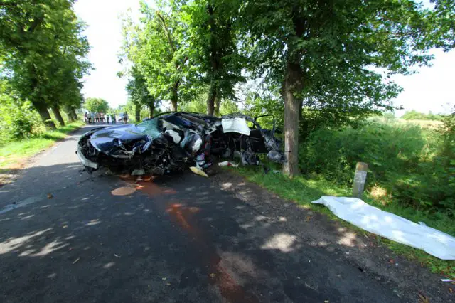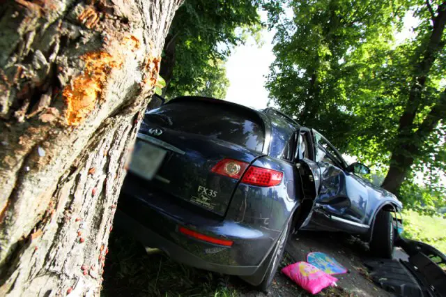 Infiniti musiał jechać z olbrzymią szybkością. Kierowca minął przejazd kolejowy i za chwilę stracił panowanie nad kierownicą. Samochód uderzył w drzewo bokiem z od strony kierowcy. Siła uderzenia musiała być olbrzymia. Samochód zgiął się w pół. Bok został dosłownie „oskalpowany”.