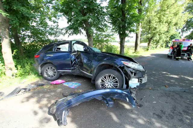 Infiniti uderzyło w drzewo z taką siłą, że zza kierownicy wypadł mężczyzna, bok auta dosłownie „oskalpowało”, a samochód zgiął się w pół.