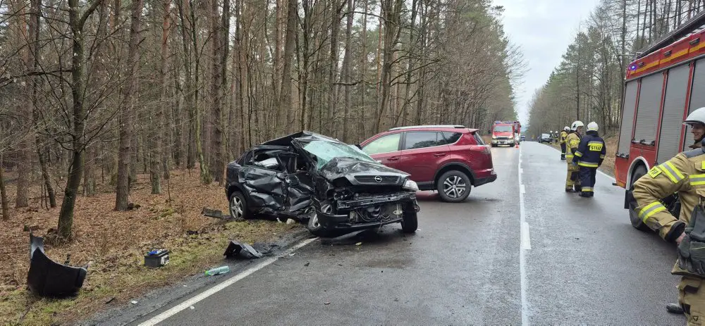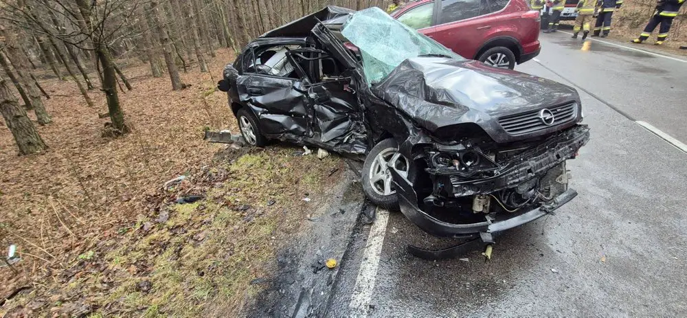Ze wstępnych ustaleń policjantów na miejscu wypadku. wynika, że kierująca oplem na zakręcie w lesie straciła panowanie nad kierownicą. Samochód wpadł w poślizg, zjechała na przeciwny pas ruchu i tam bokiem uderzył w Toyotę, którą kierował 66-letni mężczyzna. Siła zderzenia była bardzo duża. Opel został złamany. Toyota ma roztrzaskany przód.