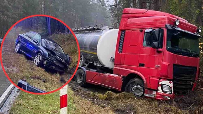 Nieprawidłowe wymijanie osobówki z pojazdem ciężarowym było przyczyną wczorajszego zderzenia w miejscowości Kozaki. Opel uderzył w ciężarówkę i oba wypadły na pobocze.