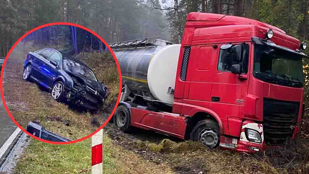 Nieprawidłowe wymijanie osobówki z pojazdem ciężarowym było przyczyną wczorajszego zderzenia w miejscowości Kozaki. Opel uderzył w ciężarówkę i oba wypadły na pobocze.
