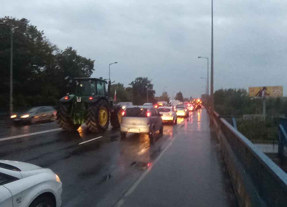 Sznur ciągników jadących bardzo wolno spowalnia ruch. To nie jest całkowita blokada, jak zapowiadali rolnicy, ale i tak w mieście tworzą się korki.