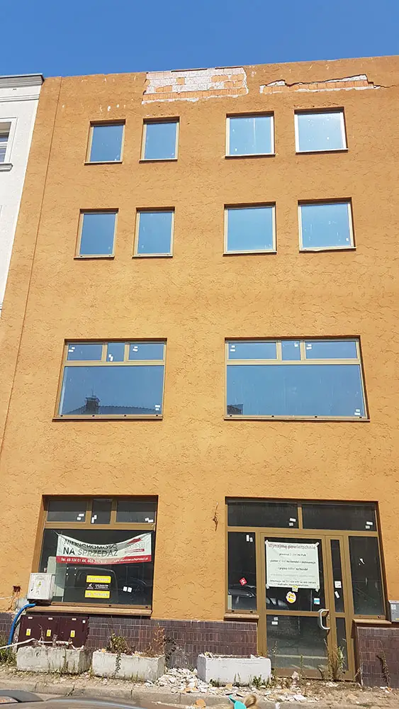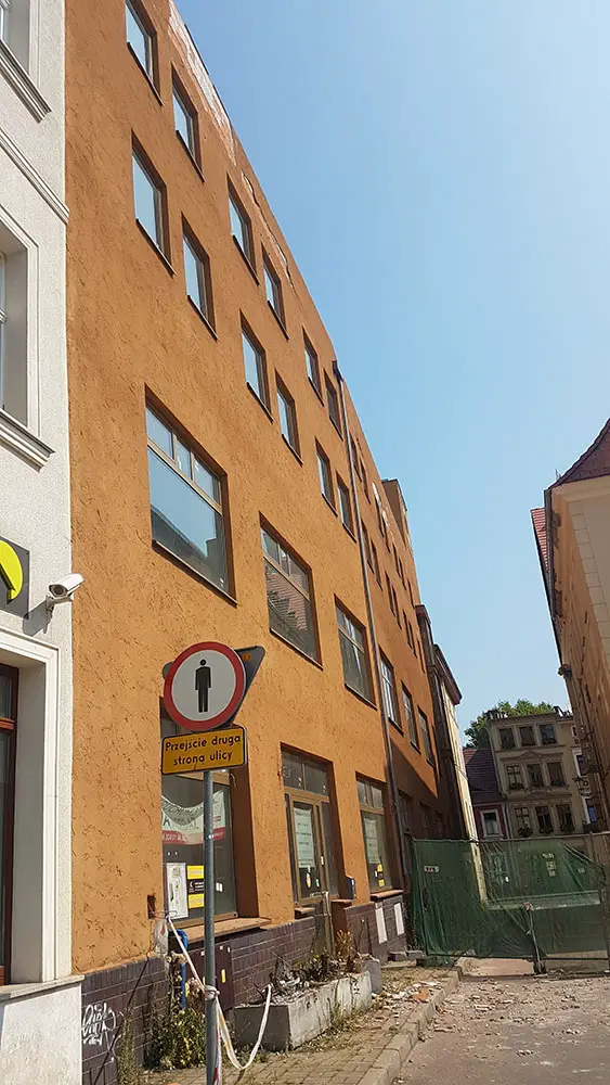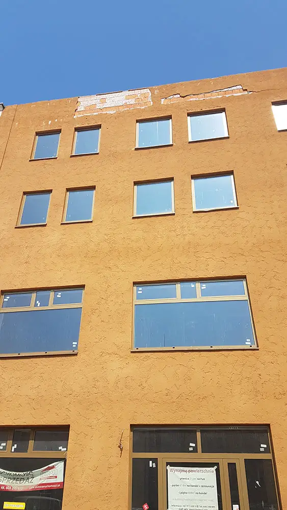 Kawałki ściany odpadają z elewacji budynku na Placu Pocztowym. – Może ktoś coś z tym zrobi, zanim dojdzie do nieszczęścia – pisze Łukasz.