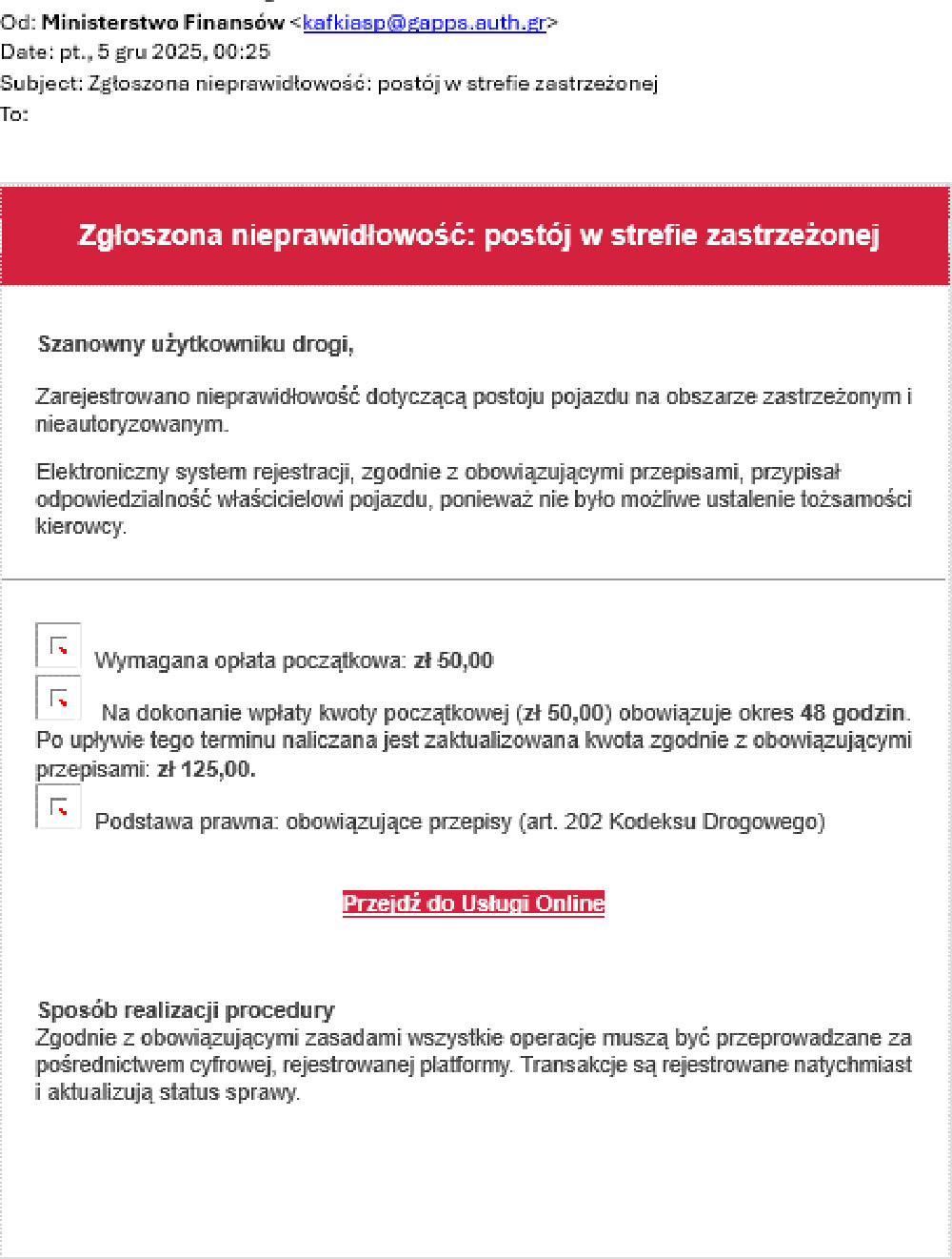 Zwracaj uwagę na adres nadawcy e-maila. Jeśli nie kończy się na „gov.pl”, a wiadomość dotyczy spraw urzędowych, zwiększ czujność. Przestrzegamy przed oszustami, którzy za pomocą fałszywych e-maili próbują wyłudzić dane lub środki finansowe. Oszuści wysyłają fałszywe wiadomości e-mail, w których widnieje żądanie zapłaty za rzekomy postój w strefie zastrzeżonej.
