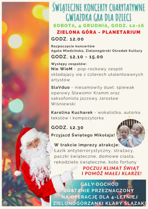 Charytatywny koncert zaczął się w sobotę, 4 grudnia, o godz. 12.00 i potrwa do godz. 16.00. Został przeniesiony spod filharmonii do planetarium Wenus, dzięki czemu pogoda nie przeszkodzi w świetnej zabawie.