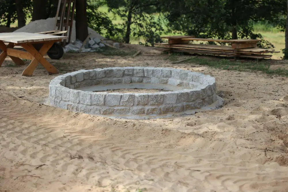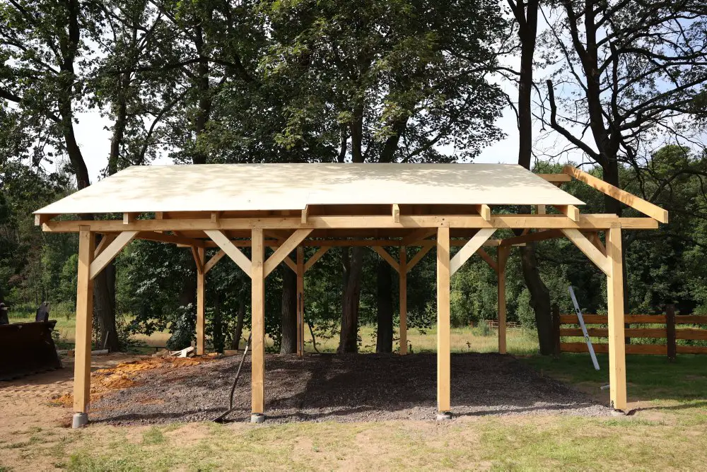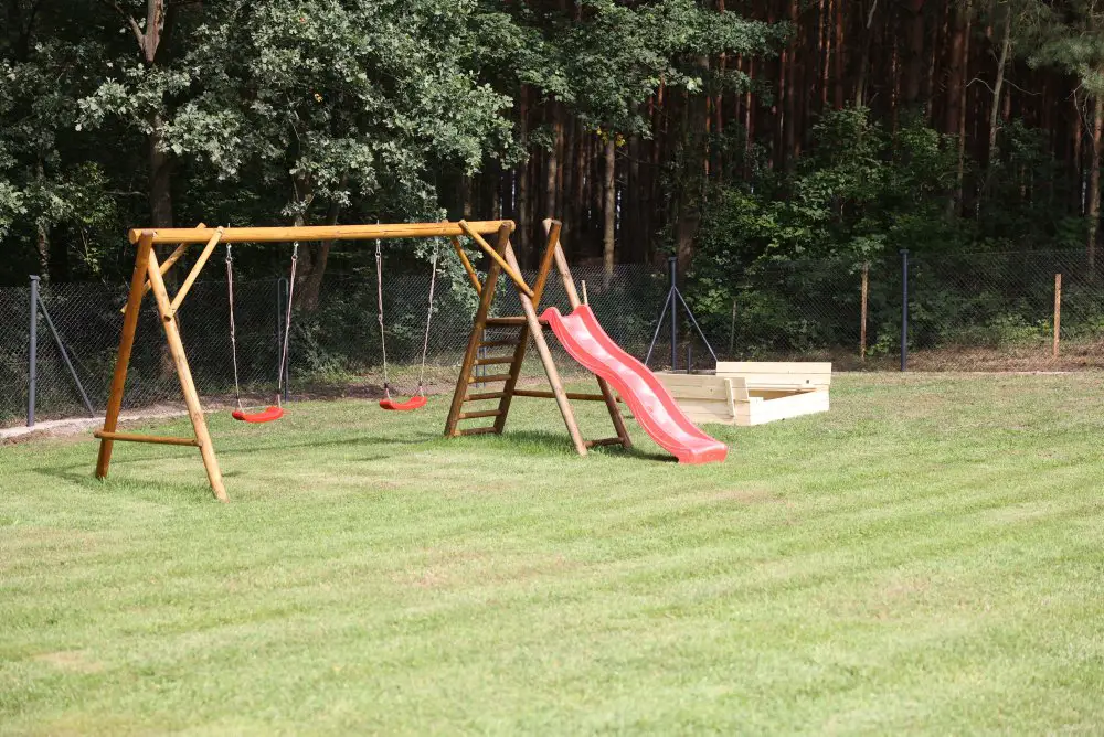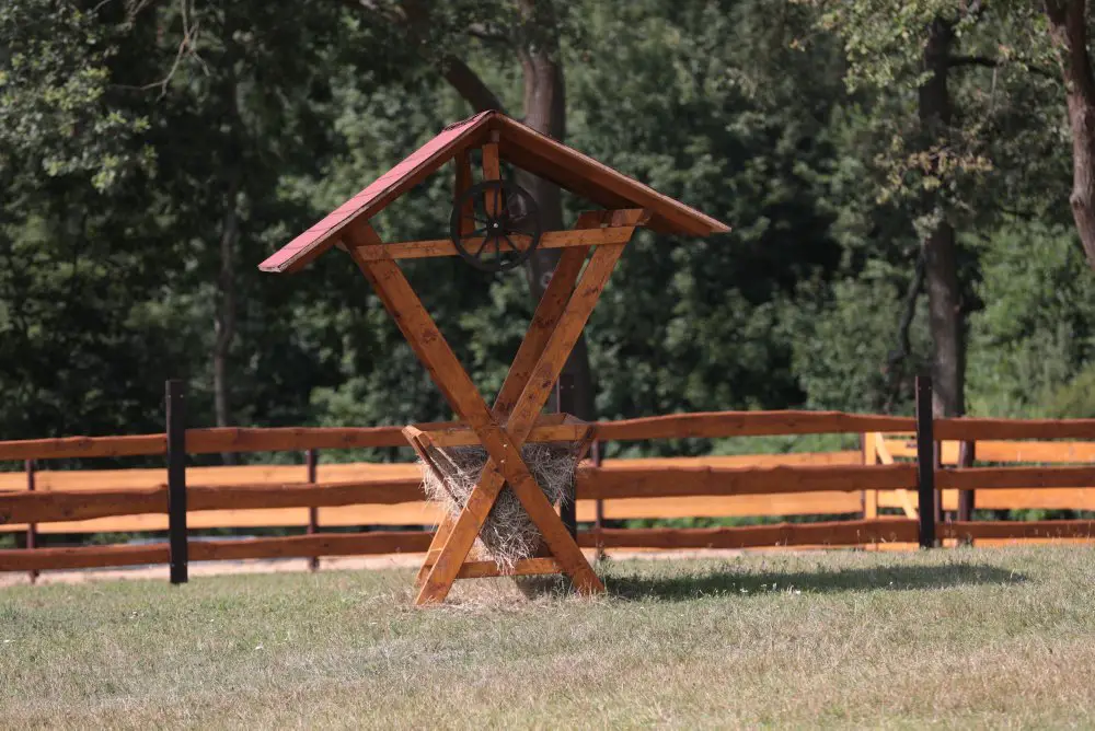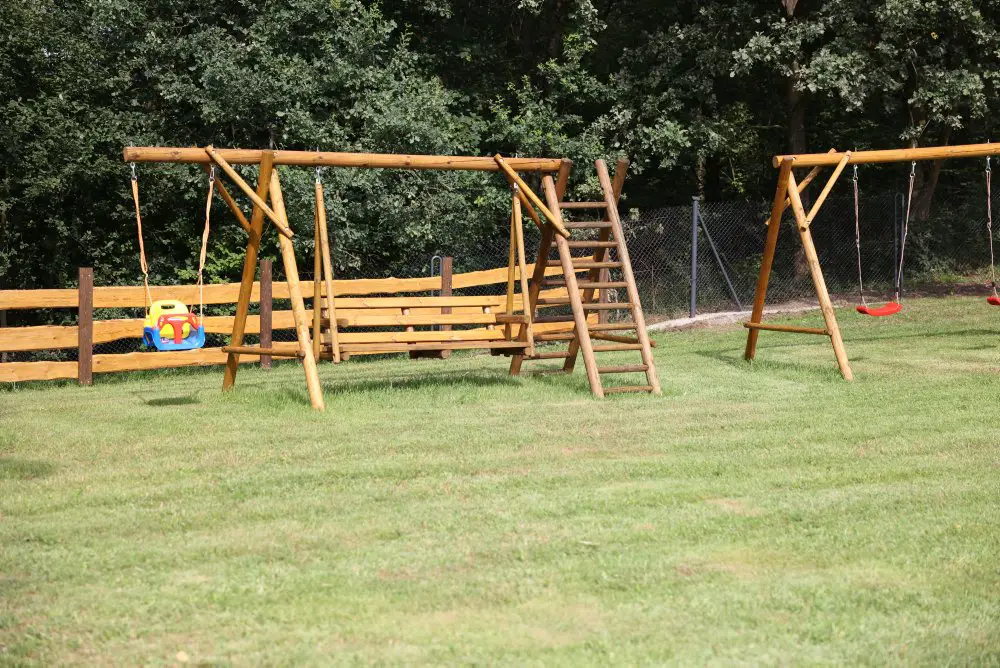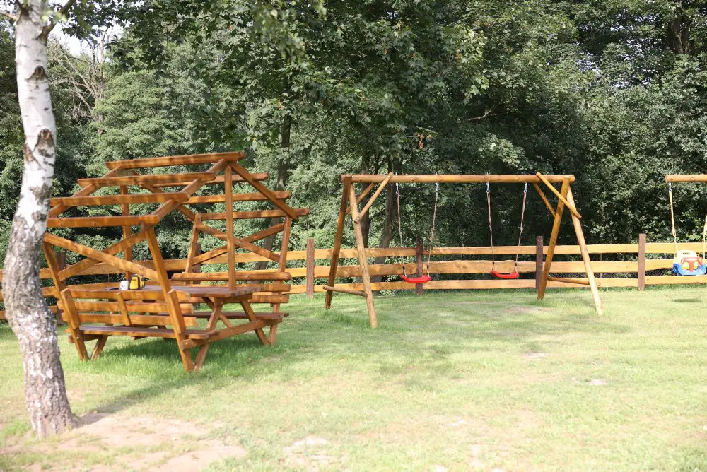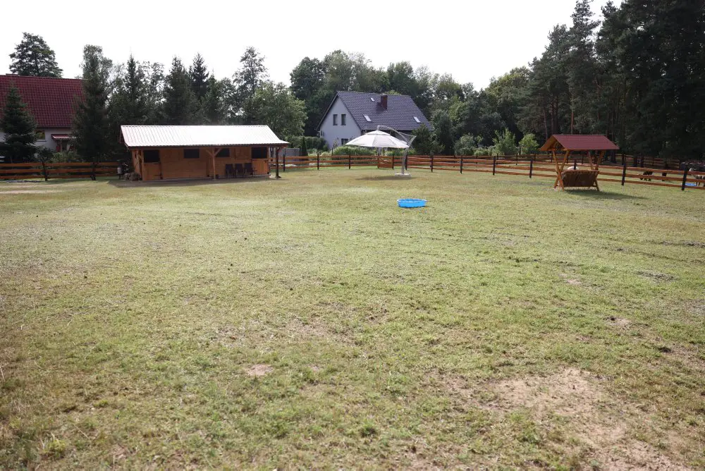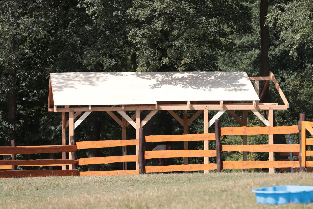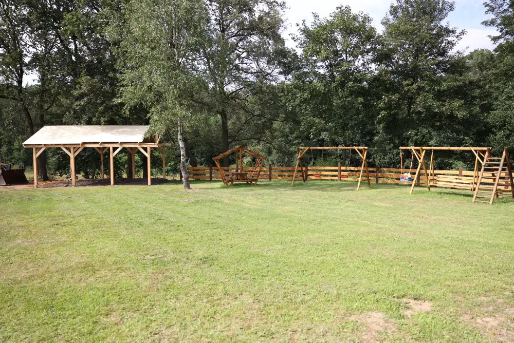 Trafiamy do pięknego miejsca. Zagroda jest ogrodzona efektownym płotem z desek. Obok stoi już niemal gotowa wiata oraz miejsce na wielkie ognisko. Z boku gotowe miejsce do zabaw dla dzieci z huśtawkami i nie tylko. Wszystko pięknie zrobione z drewna.