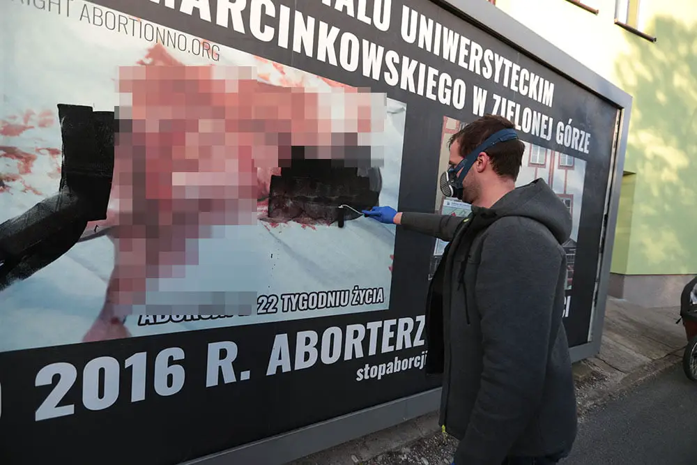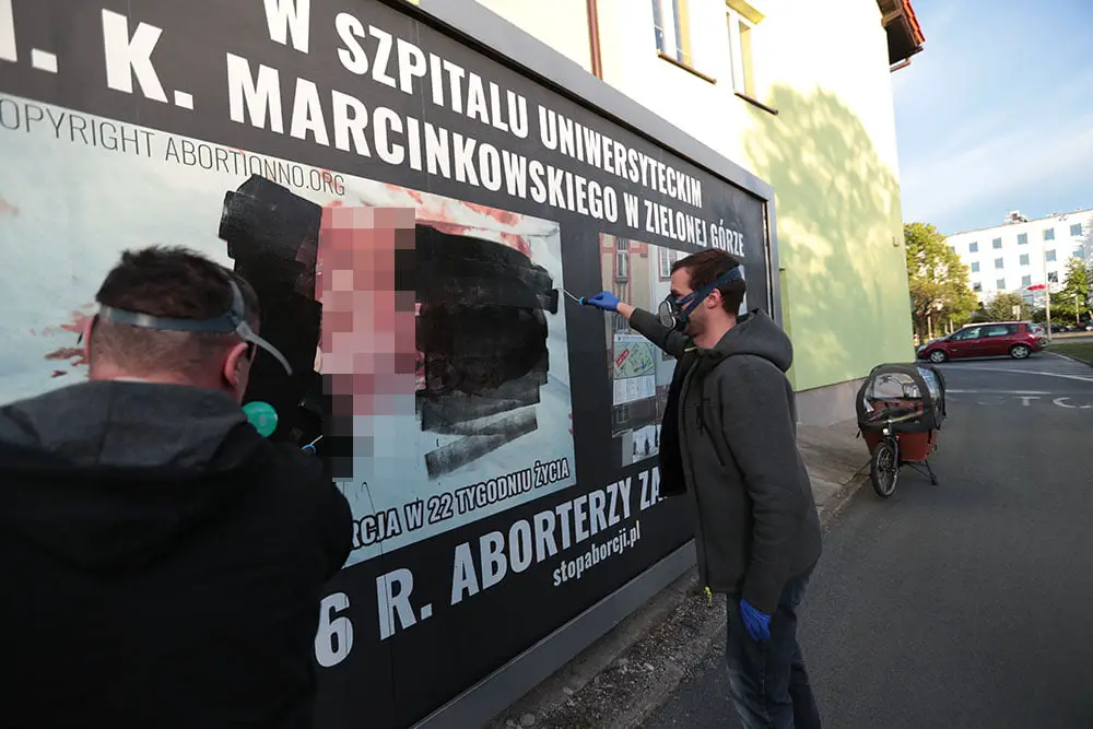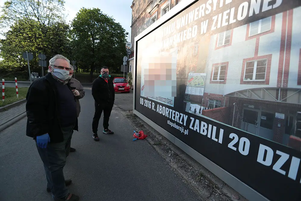 Robert Górski, na co dzień lekarz zielonogórskiego pogotowia ratunkowego, zauważył ordynarny billboard antyaborcyjny, który pojawił się przy wjeździe do Urzędu Miasta. Widać było na nim rozerwane dziecko we krwi, wejście do zielonogórskiego szpitala oraz napis „W szpitalu w Zielonej Górze w 2016 r. aborterzy zabili 20 dzieci”. Billboard jest doskonale widoczny również z drogi prowadzącej do szpitala. – Wierzę w Boga i chodzę do kościoła. Bardzo nie podobają mi się takie akcje katotalibanu – mówi R. Górski. Dlatego kupił czarną farbę i wałki malarskie. Skrzyknął radnych Andrzeja Bocheńskiego, Andrzej Brachmańskiego oraz Filipa Czeszyka. Pomógł chętnie również ratownik medyczny Maciej Klim.