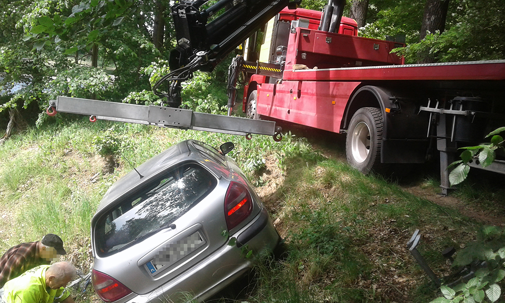 Na miejsce przyjechała wezwana pomoc drogowa. – Nie było jak podjechać do nissana holownikiem ani lawetą – mówi Marek Dziubałka z pomocy drogowej Maxmar w Zielonej Górze. Na miejsce przyjechał dźwig. – To była trudna akcja ze względu na miejsce – zaznacza M. Dziubałka.