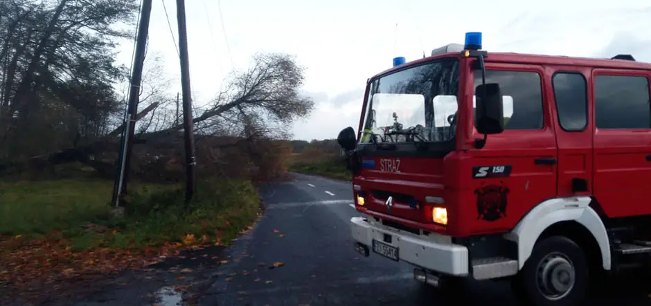 Jednostka OSP Leśniów Wielki w niedzielę 29 października pracowała przy zerwanej przez wiatr linii niskiego napięcia. Cały czas wieje silny wiatr orkanu Grzegorz.