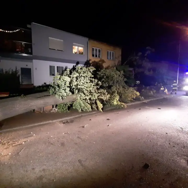 Złamane wiatrem drzewo uszkodziło słup oraz lampę, która była pod napięciem. Uszkodziło również ogrodzenia dwóch posesji.