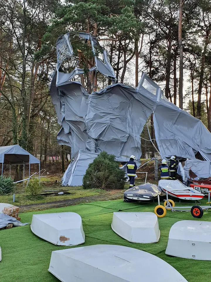 Wiatr zerwał magazyn konstrukcji namiotowej w Sławie. Pod namiotem są przechowywane żaglówki. Cała konstrukcja wraz z poszyciem zatrzymała się na sąsiadujących drzewach.