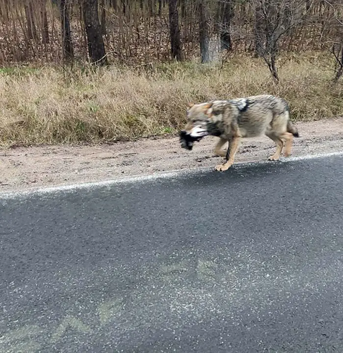 Wilk pojawił się na drodze koło Trzebicza (pow. strzelecko-drezdenecki). W paszczy niósł głowę psa, którego z pewnością upolował.