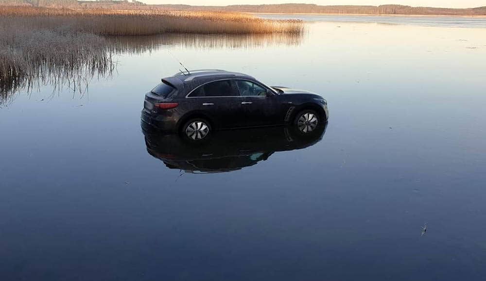 Kierowca luksusowego infiniti w sobotę, 2 marca, jechał drogą w miejscowości Małe Swornegacie. Wypadł z trasy i wjechał do jeziora. Kierowca może mówić jednak o wielkim szczęściu. W miejscu, do którego wpadł w jeziorze było płytko.