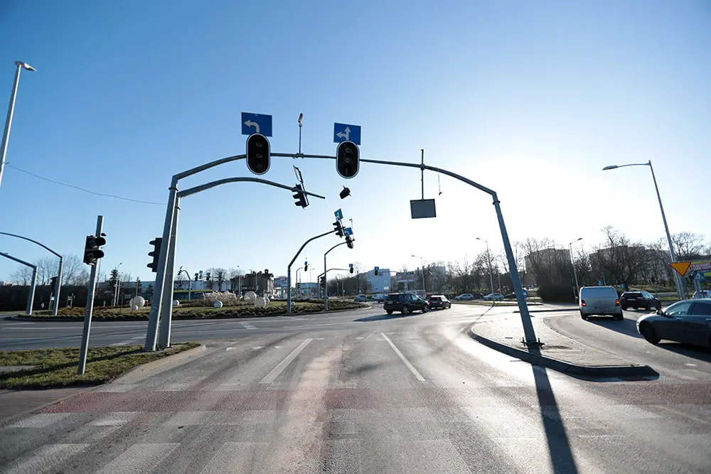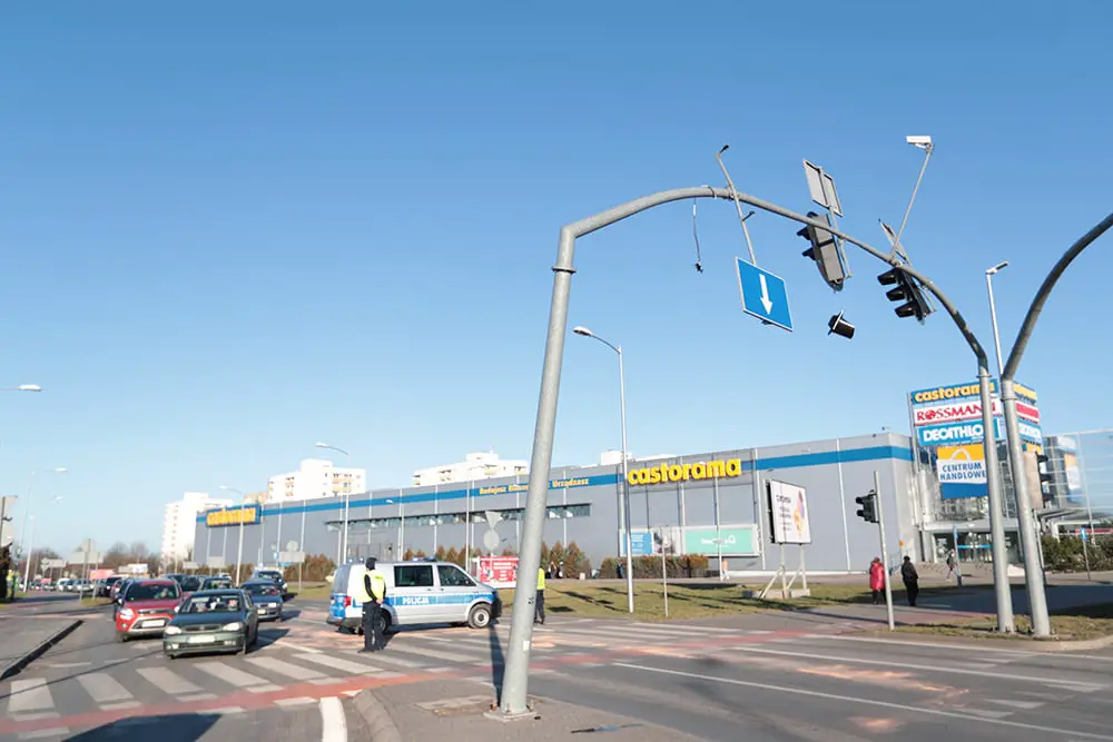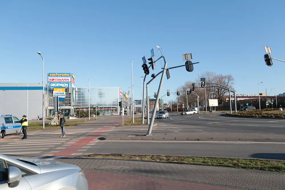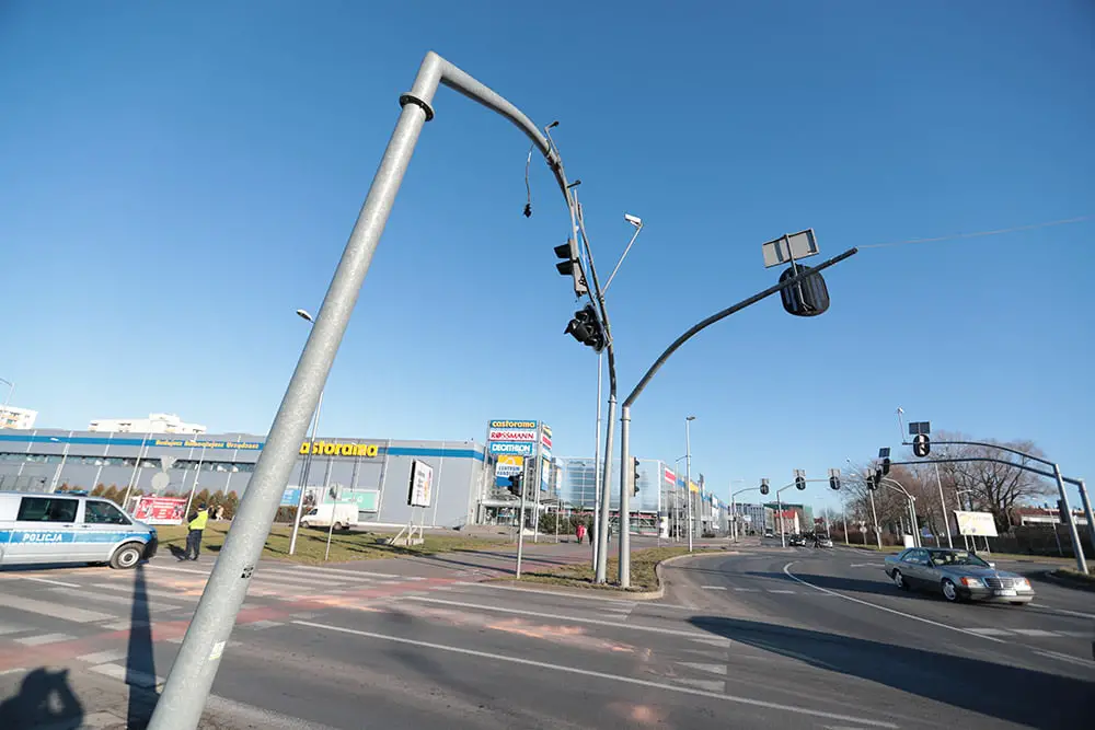Na miejsce przyjechały służby ratunkowe. – Rondo początkowo zabezpieczali strażacy – mówi st. kpt. Arkadiusz Kaniak, rzecznik zielonogórskich strażaków. Potem pasy ruchu w kierunku ul. Dąbrówki i w lewo do ul. Wojska Polskiego zablokowała policja. Jak powiedziały nam służby zajmujące się sygnalizacją w mieście, słup może runąć na jezdnię. Na rondzie PCK nie ma również sygnalizacji świetlnej. A to najbardziej oblegane rondo w mieście.