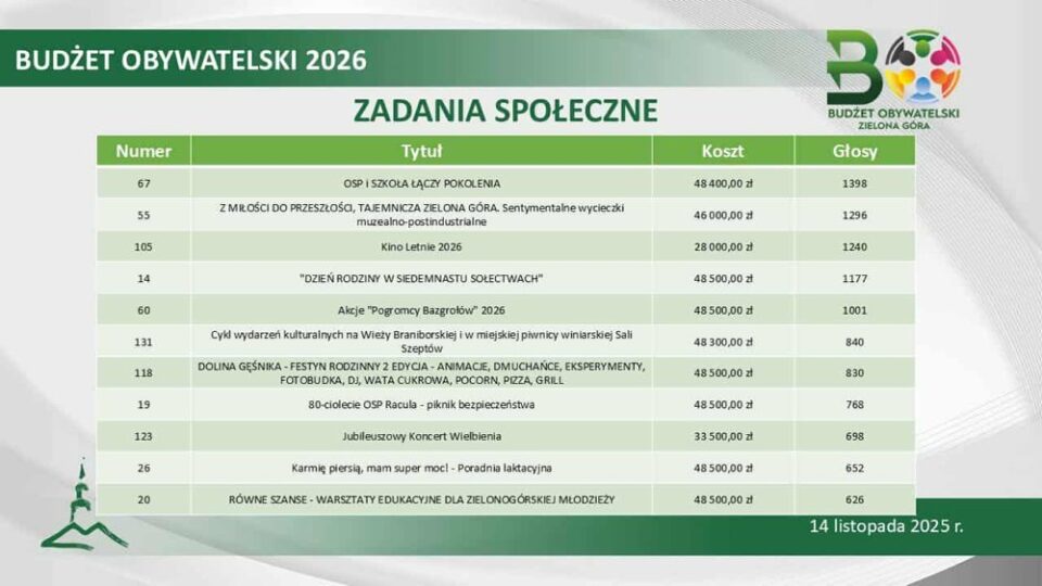 Łącznie magistrat sfinansuje 23 inicjatywy społeczne. Największą popularnością cieszył się projekt „OSP i szkoła łączy pokolenia” (1398 głosów). Ale na podium, z pokaźnym poparciem, znalazło się także zadanie „Z miłości do przeszłości, tajemnicza Zielona Góra”, czyli wycieczki muzealno-poindustrialne (1296 głosów) oraz „Kino letnie 2026” (1240 głosów).