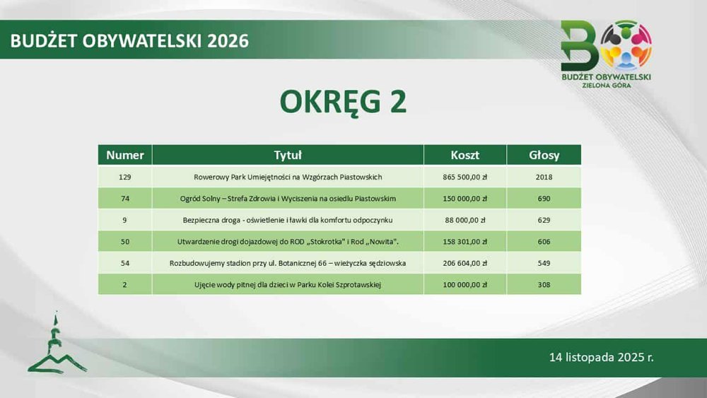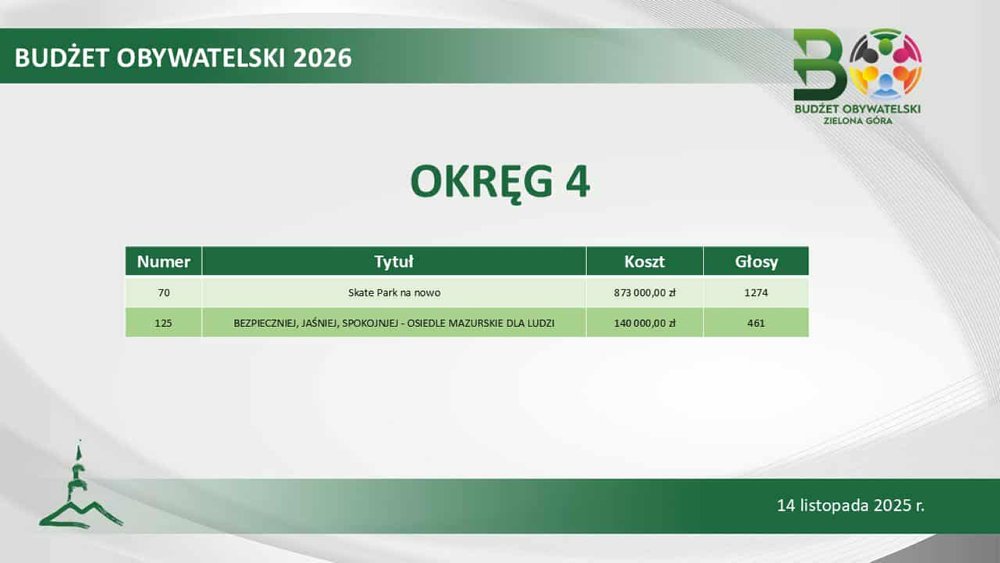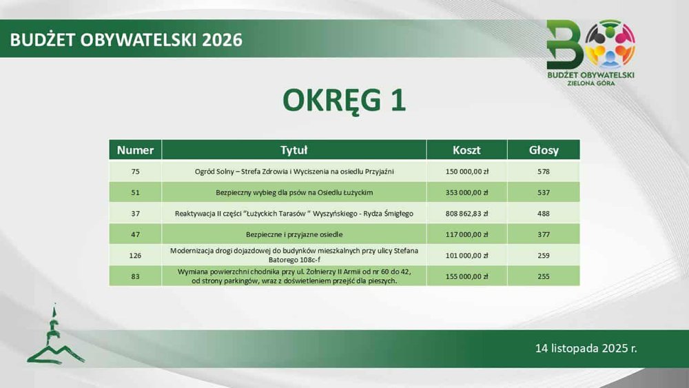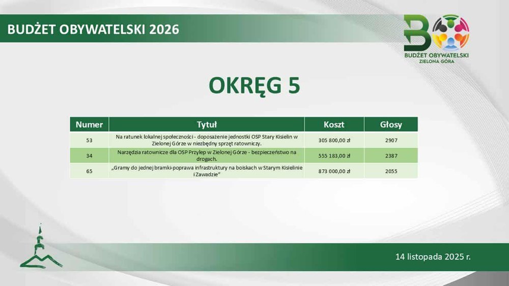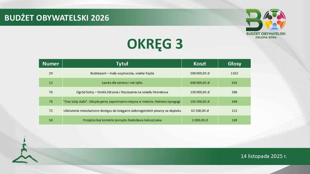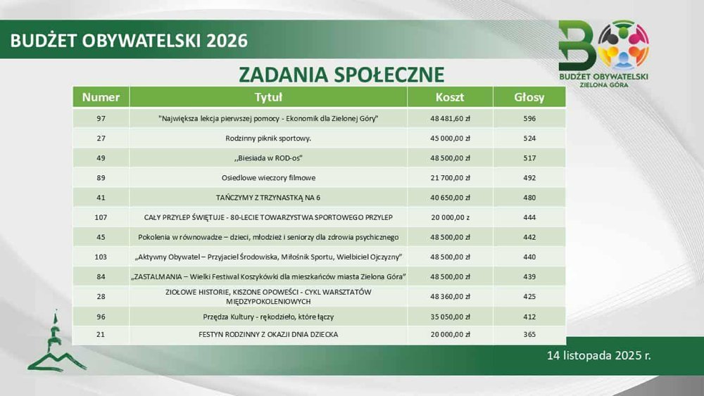 Łącznie magistrat sfinansuje 23 inicjatywy społeczne. Największą popularnością cieszył się projekt „OSP i szkoła łączy pokolenia” (1398 głosów). Ale na podium, z pokaźnym poparciem, znalazło się także zadanie „Z miłości do przeszłości, tajemnicza Zielona Góra”, czyli wycieczki muzealno-poindustrialne (1296 głosów) oraz „Kino letnie 2026” (1240 głosów).