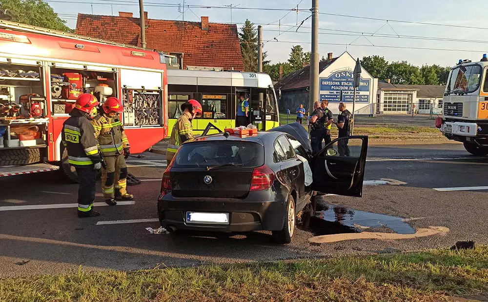 Kierujący bmw na przejeździe wjechał pod tramwaj – naukę jazdy. Maszyna przepchnęła bmw kilkanaście metrów. Siła uderzenia była potężna. Bmw zostało zmiażdżone, a w kabinie uwięziony kierowca.