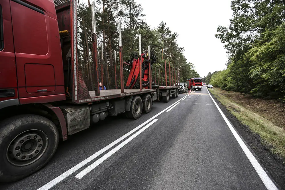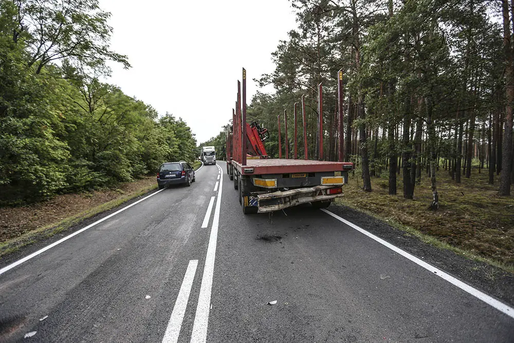 Kierujący ciężarówką jechał z Żar w kierunku Nowogrodu Bobrzańskiego. Tuż przed miejscowością zauważył przed sobą jadącego rowerzystę. Zwolnił szykując się do jego ominięcia. Zwalniającej ciężarówki nie zauważył kierujący busem. Rozpędzony bus uderzył w tył naczepy do przewozu drewna.