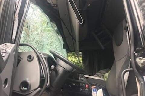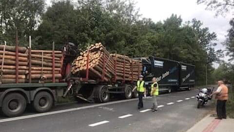 Do wypadku doszło w piątek, 10 sierpnia, w Jeleniowie. Kierowca ciężarówki uderzył w tył drugiej ciężarówki przewożącej drewno.