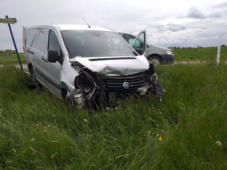 Kierujący busem firmy kurierskiej uderzył w bok mitsubishi, którym prawidłowo jechała listonoszka z poczty. Siła zderzenia była na tyle duża, że oba samochody wypadły z drogi.
