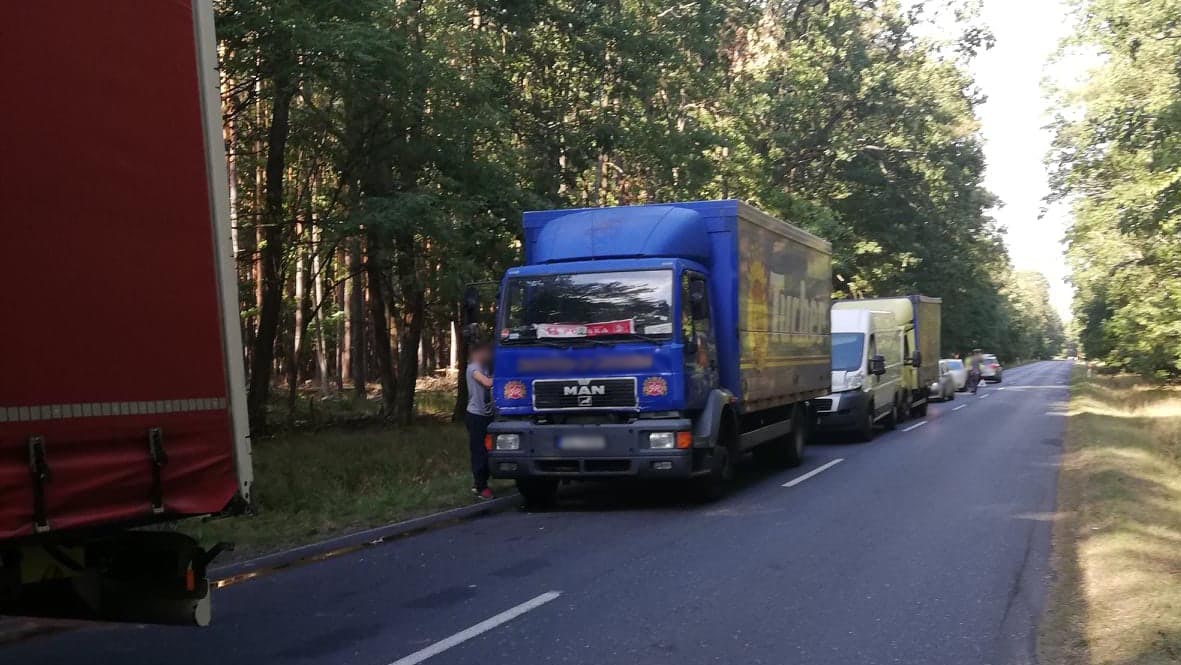 W stojącą przed światłami na zwężeniu drogi ciężarówkę uderzyła druga ciężarówka. W ciężarówkę uderzył jeszcze bus. Jedna osoba została przewieziona do szpitala.