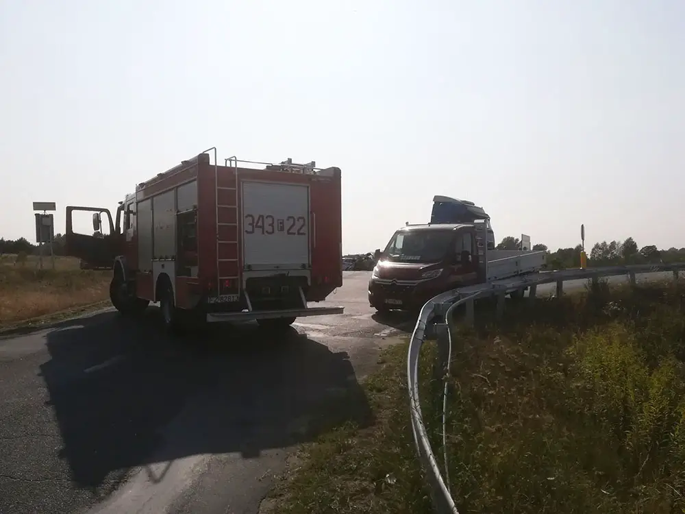 Na miejscu zdarzenia są służby ratunkowe. Droga jest zablokowana. Policjanci kierują ruchem.