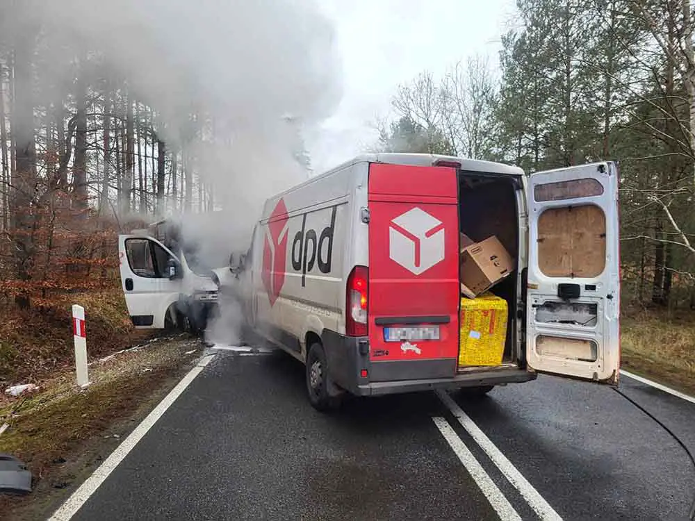 Kierujący busem firmy kurierskiej jadąc uderzył lekko w samochód jadący przed nim. Wtedy stracił panowanie nad kierownicą i zjechał na przeciwległy pas ruchu. Tam doprowadził do czołowego zderzenia z prawidłowo jadącym busem firmy meblarskiej. Po zderzeniu busy zapaliły się.