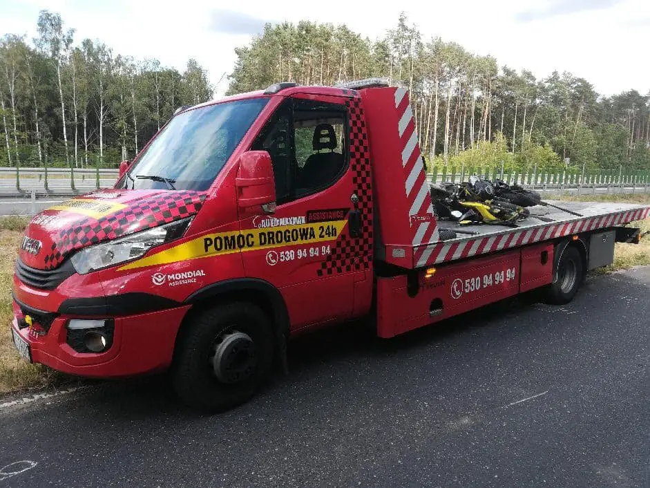 Godz. 16.05 Motocykl na polecenie policji został zabezpieczony przez pomoc drogową Maxmar. Na drodze nie ma już utrudnień w ruchu.