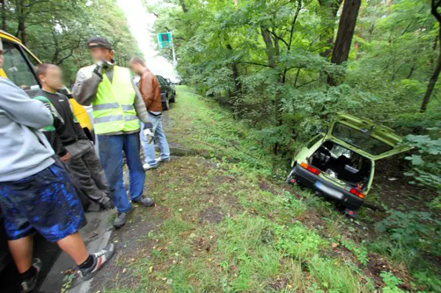 Kierowca seata uderzył w bok cinquecento, które wypadło z drogi, zjechało ze skarpy i uderzyło w drzewo.