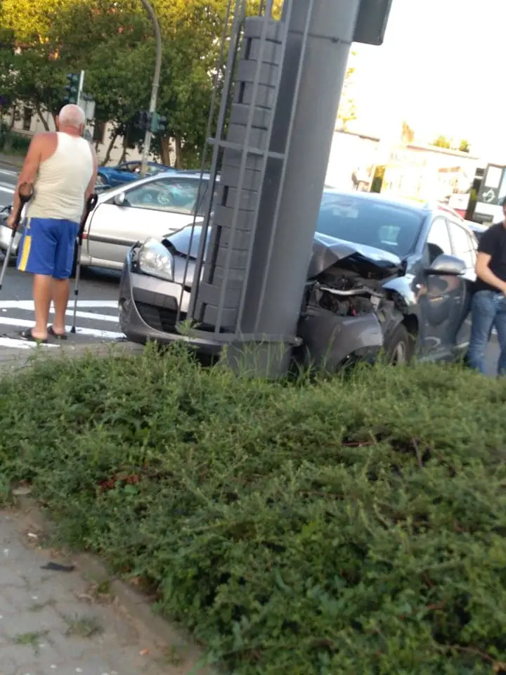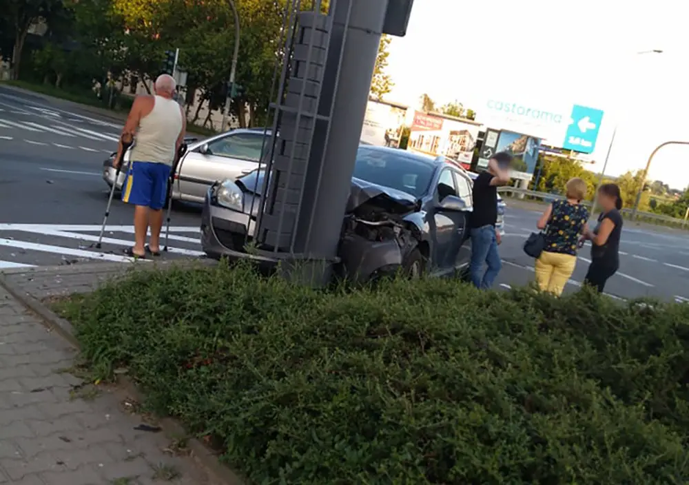Kierujący renault jechał ul. Warszawską. Skręcał na rondzie w ul. Podmiejską. Zrobił to na czerwonym świetle i doprowadził do zderzenia z toyotą. Renault odbiło się do toyoty i uderzyło w słup. Na miejsce wypadku przyjechały służby ratunkowe. Pasażerka toyoty została przewieziona do szpitala.