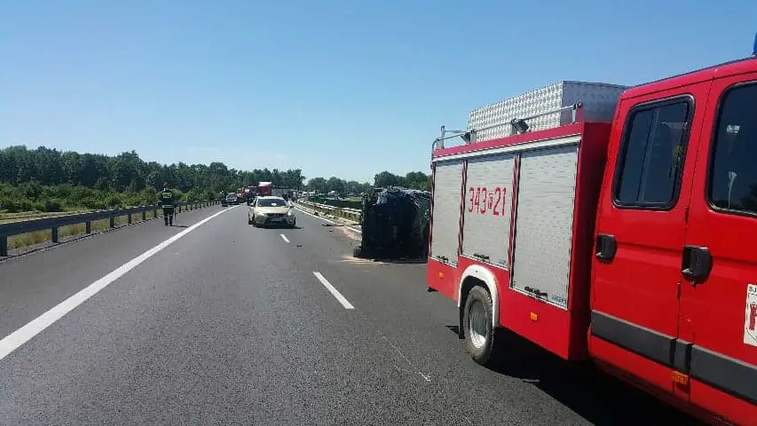 Samochód po uderzeniu w lawetę wyleciał w powietrze i dachował upadając na pas ruchu w przeciwnym kierunku. Na szczęście, mimo bardzo groźnie wyglądającego zdarzenia, nikomu nic się nie stało.