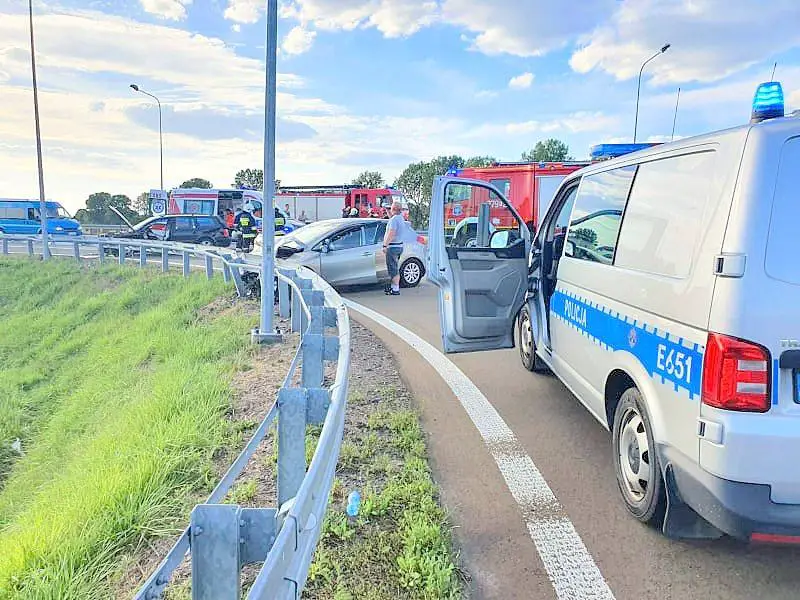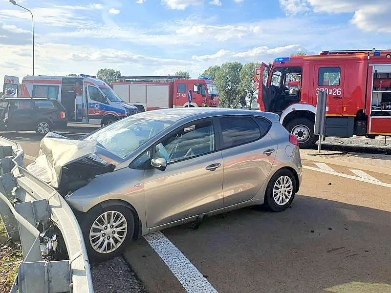 Wjeżdżający na krzyżówkę od strony Chełmska volkswagen passat nie ustąpił pierwszeństwa prawidłowo jadącemu kierowcy samochodu kia. Doszło do czołowo-bocznego zderzenia. Jedna osoba została zakleszczona w samochodzie.