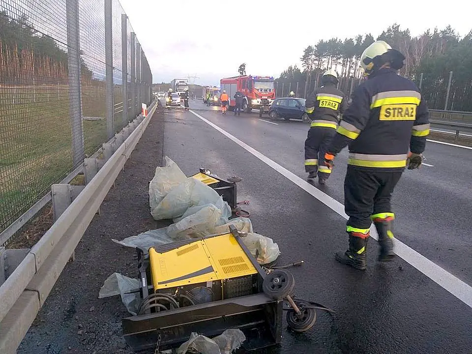 Na drogę wypadły przewożone w przyczepce agregaty spawalnicze rozsypując się w promieniu około 20 m. Na miejsce zdarzenia dojechali międzyrzeccy policjanci.