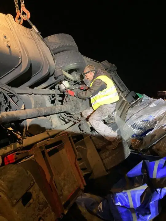 Butelki zostały zebrane spychaczem, a potem były zbierane ręcznie. To żmudna praca. Dopiero na koniec zaczęto podnosić ciężarówkę. – Została podniesiona dźwigiem – mówi M. Dziubałka.