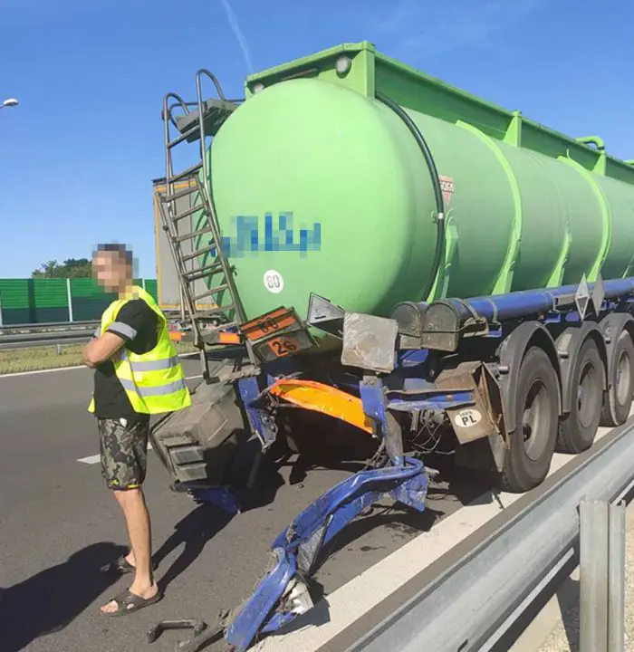 Kierująca samochodem osobowym jechała w kierunku Zielonej Góry. W pewnym momencie uderzyła w tył cysterny. Siła uderzenia była duża. Samochód ma całkowicie zmiażdżony przód. Na miejsce wypadku przyjechały służby ratunkowe. Kierująca oraz dziecko karetka pogotowia ratunkowego przewiozła do szpitala. Na miejscu jest gorzowska policja.