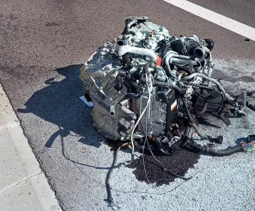 Kierujący toyota uderzył w barierki. Siła uderzenia była ogromna. Z samochodu wypadł silnik.