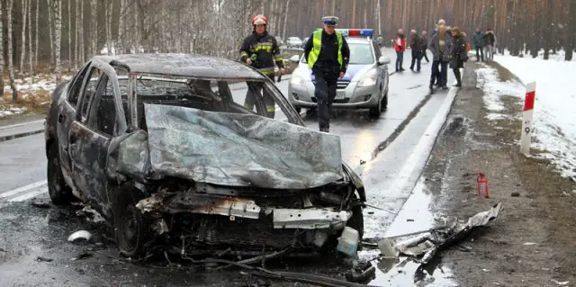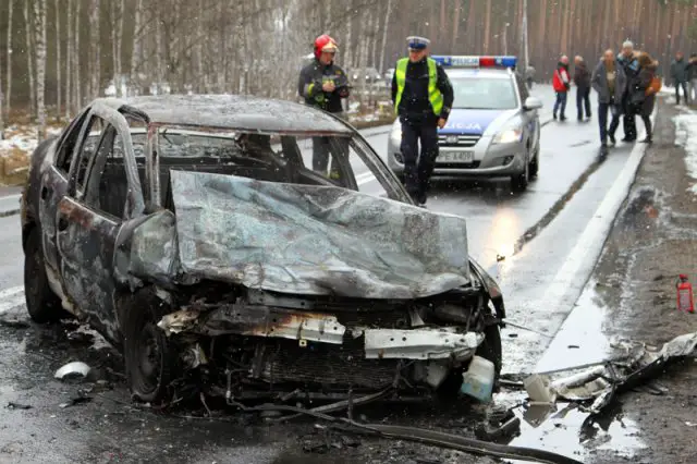 Toyota corolla na zakręcie wpadła w poślizg i bokiem zderzyła się z oplem vectrą, która po zderzeniu stanęła w płomieniach. Dwie osoby zostały ranne. Sprawczyni wypadku, kierująca toyotą, prowadziła po pijanemu.