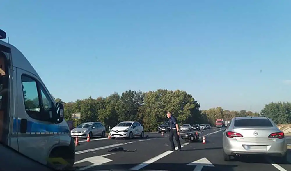 Motocyklista została zabrany do szpitala. Na miejscu wypadku pracują policjanci z zielonogórskiej drogówki.