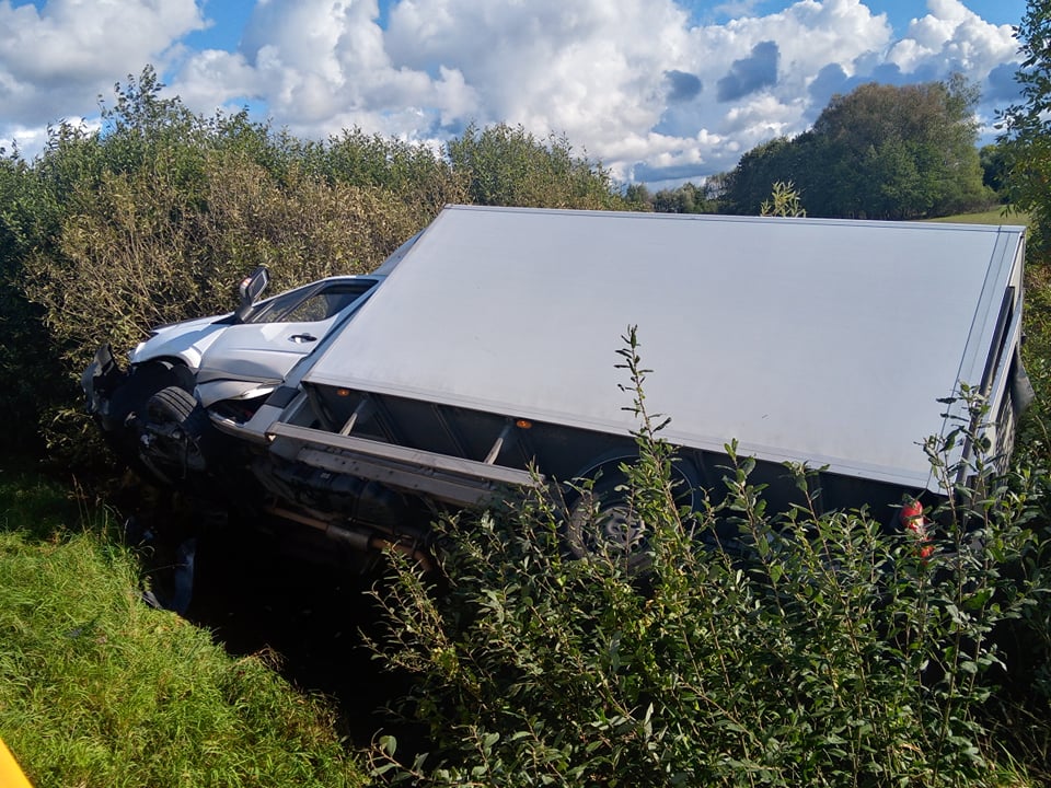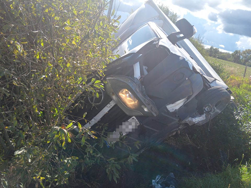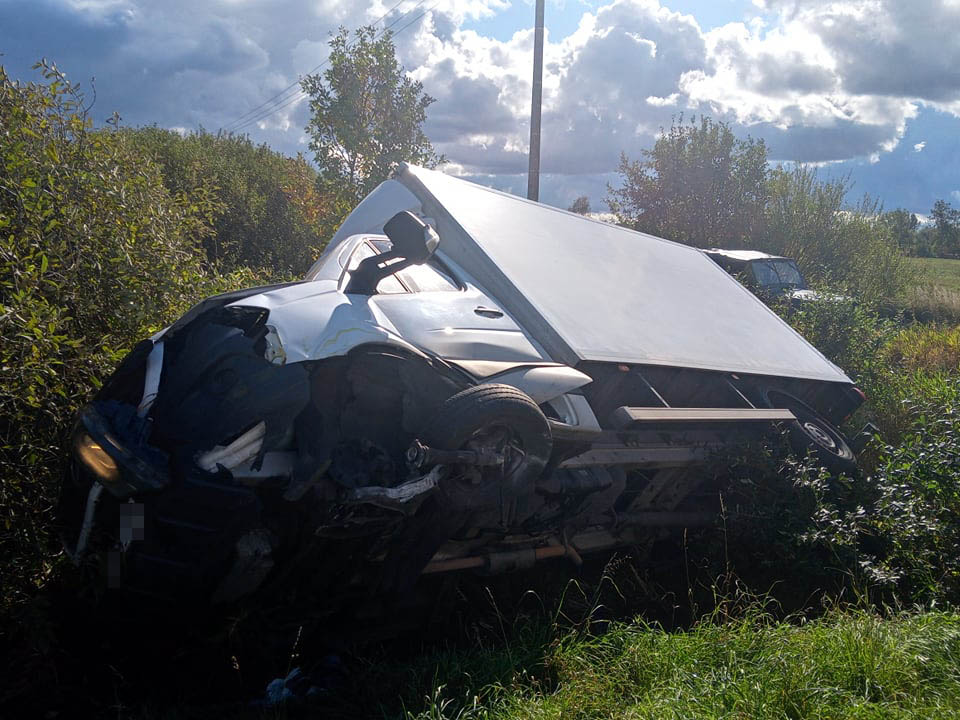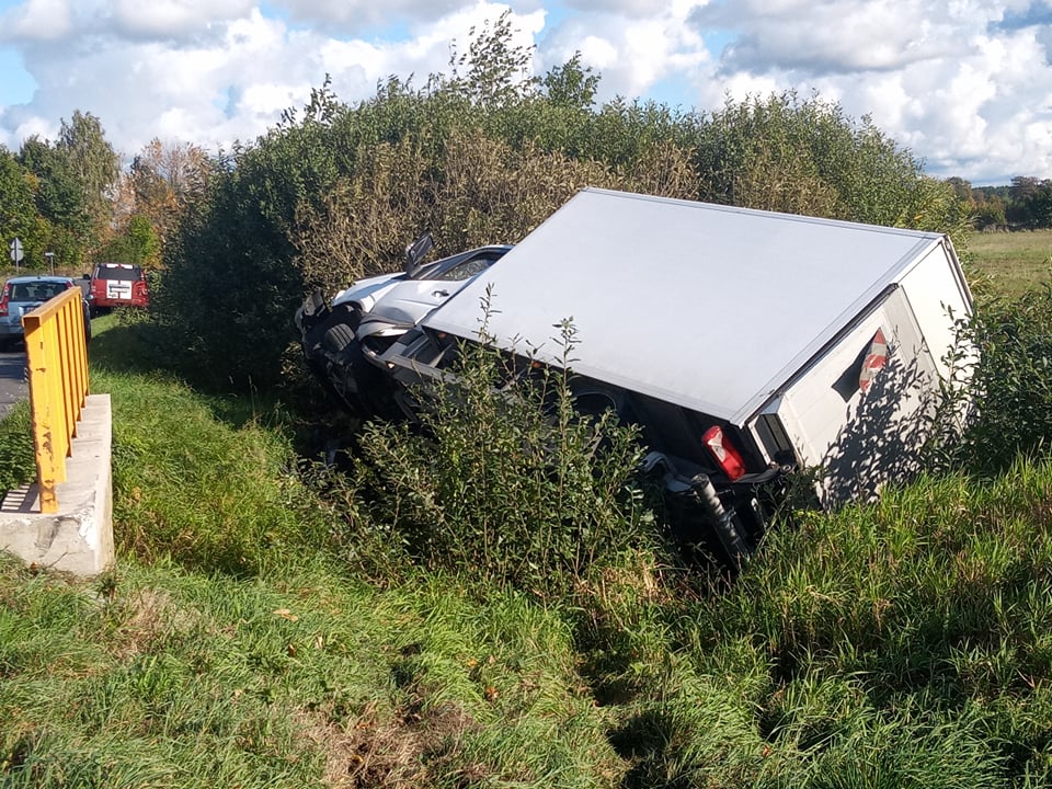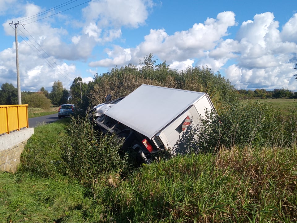 Kierujący samochodem dostawczym najprawdopodobniej jadąc zbyt szybko, na łuku drogi wpadł w poślizg. Uderzył w mostek i wypadł z drogi. Bus przewrócił się na poboczu.