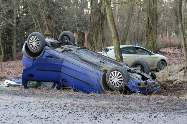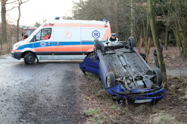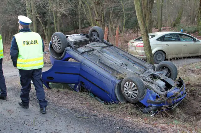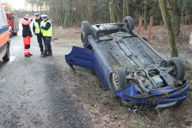 Kierowca opla wpadł w poślizg na łuku drogi. Samochód wypadł z trasy i dachował. Na miejsce przyjechała karetka pogotowia, straż pożarna i policja.
